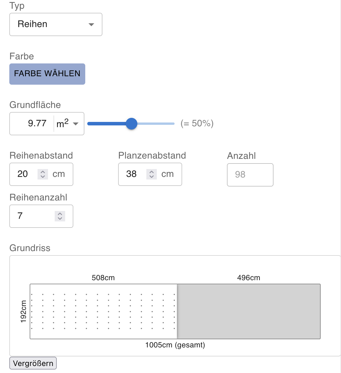 Reihen eignen sich, um die Belegungen von Feldern zu planen. Hier lassen sich Reihenabstand, Pflanzenabstand und Reihenanzahl einstellen. Das Tool berechnet die mögliche Anzahl an Pflanzen.