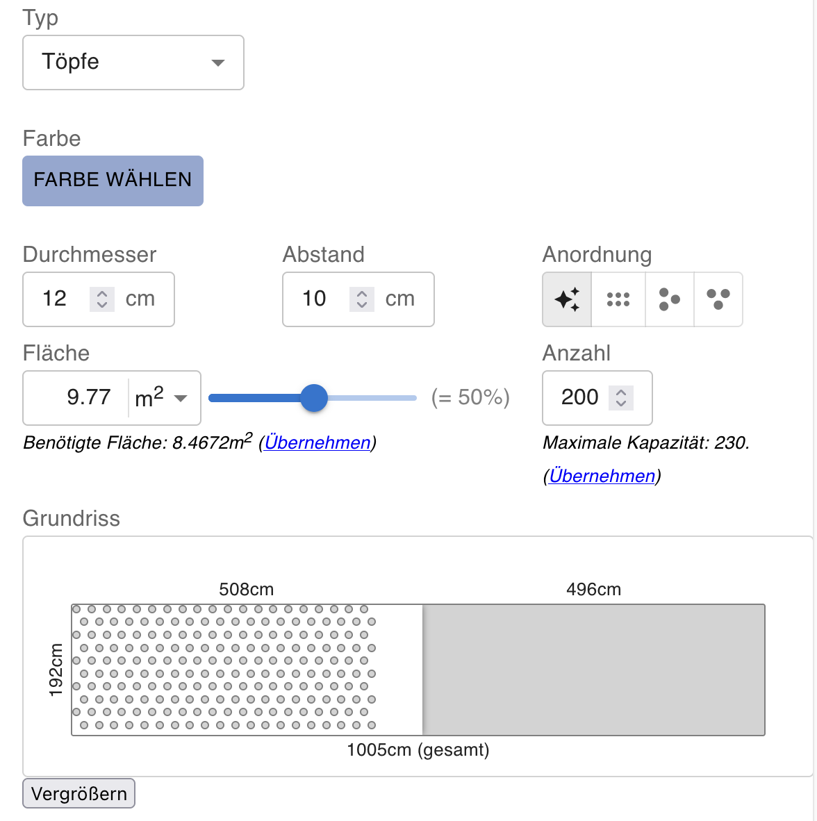 Bei Belegungen mit Töpfen lassen sich verschiedene Parameter wie Durchmesser, Abstand und Anordnung einstellen. Das Tool berechnet dann entweder die Topfanzahl, die auf eine gegebene Fläche passt, oder aber die nötige Fläche für eine bestimmte Anzahl an Töpfen.